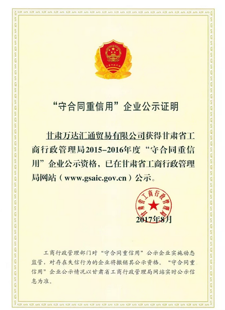 日前,甘肅省工商行政管理局對(duì)2015年—2016年度“守合同重信用企業(yè)”進(jìn)行了公示。甘肅泰和實(shí)業(yè)(集團(tuán))有限公司旗下甘肅萬達(dá)匯通貿(mào)易有限公司(以下簡(jiǎn)稱“萬達(dá)匯通”)憑借良好的企業(yè)信譽(yù),獲得了2015年—2016年度甘肅省“守合同重信用”企業(yè)榮譽(yù)稱號(hào)。