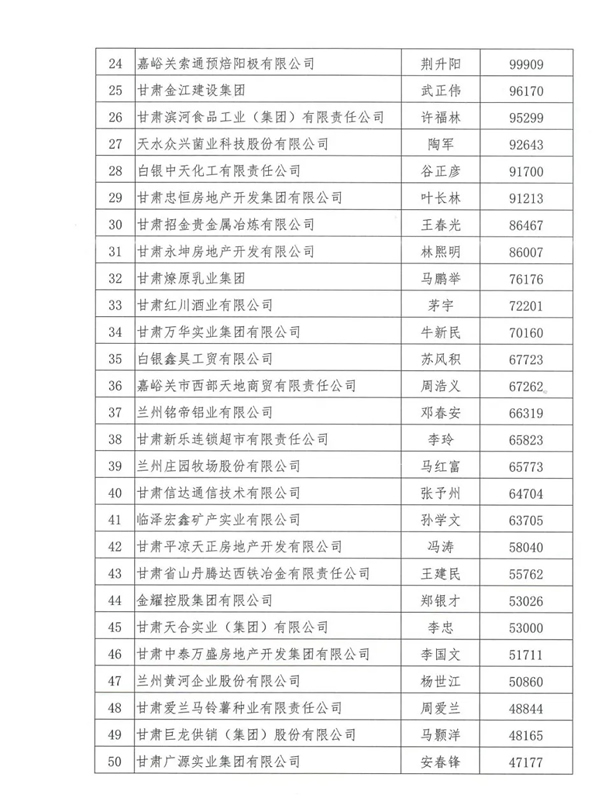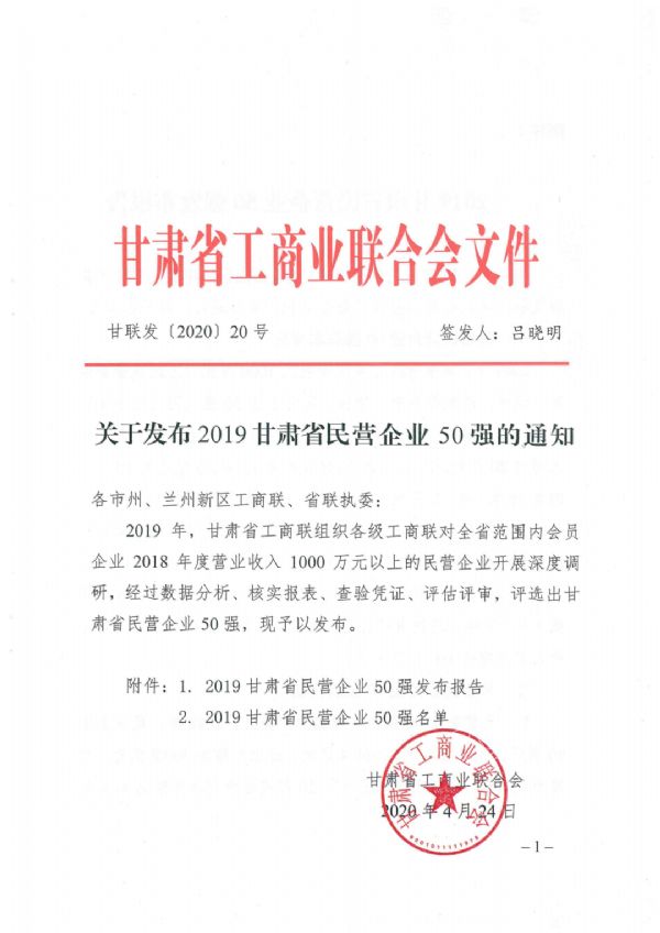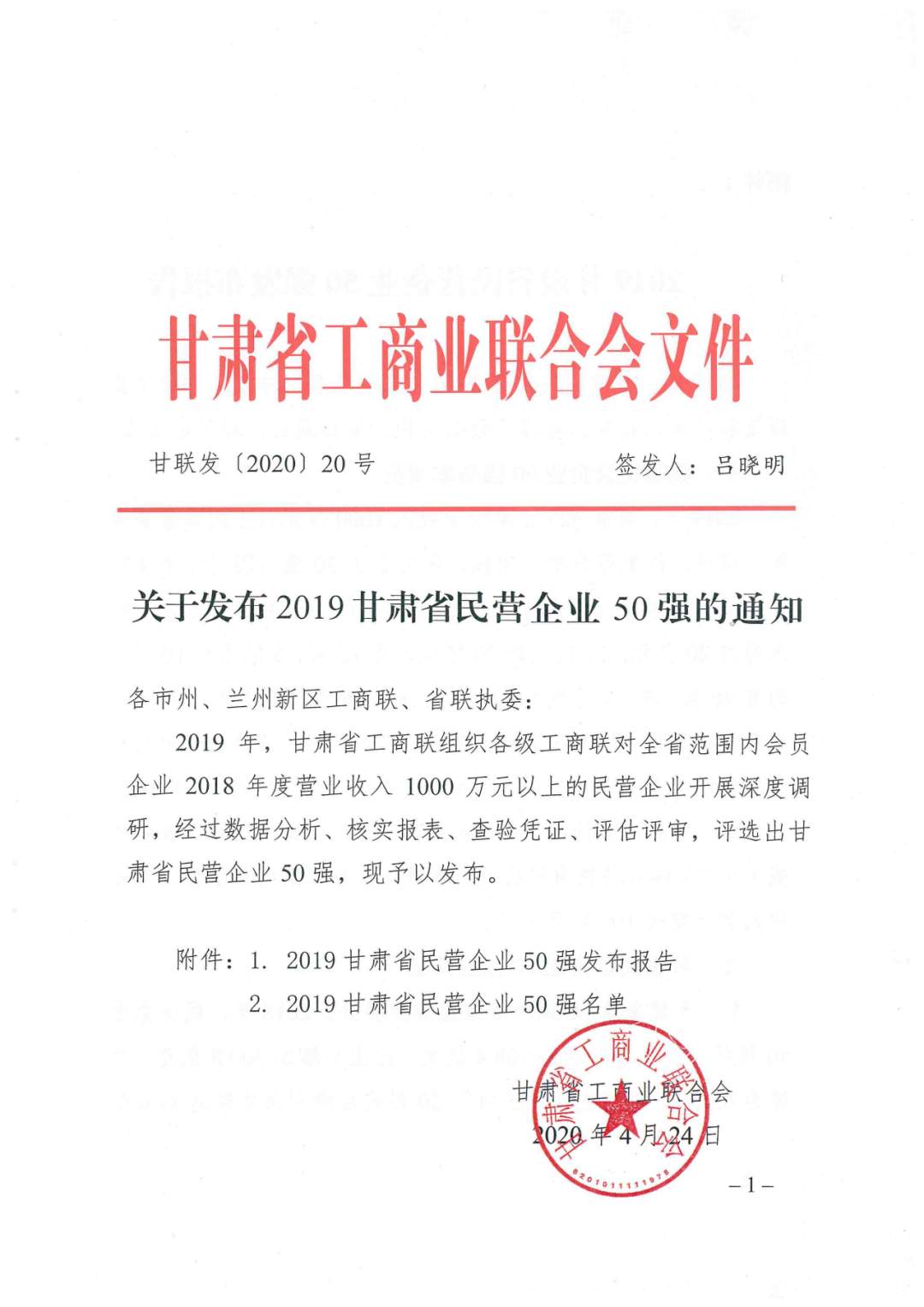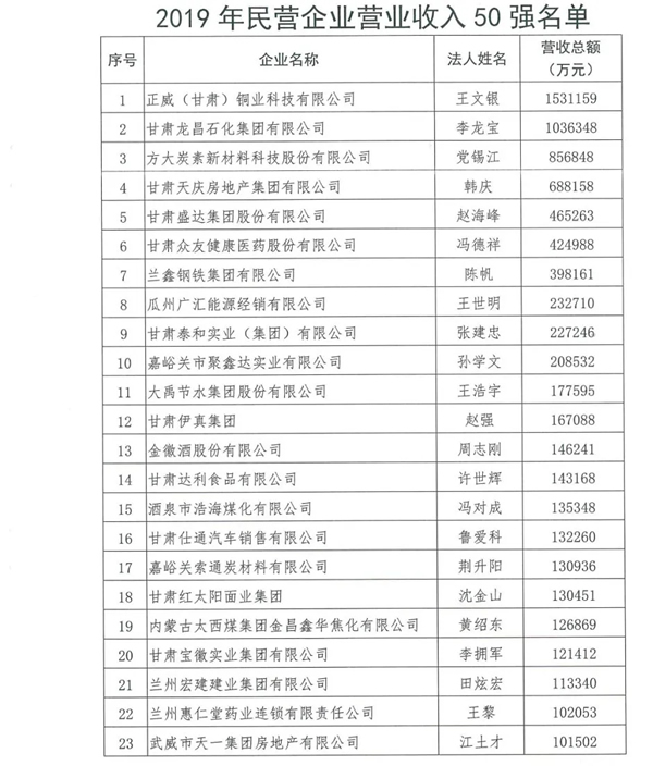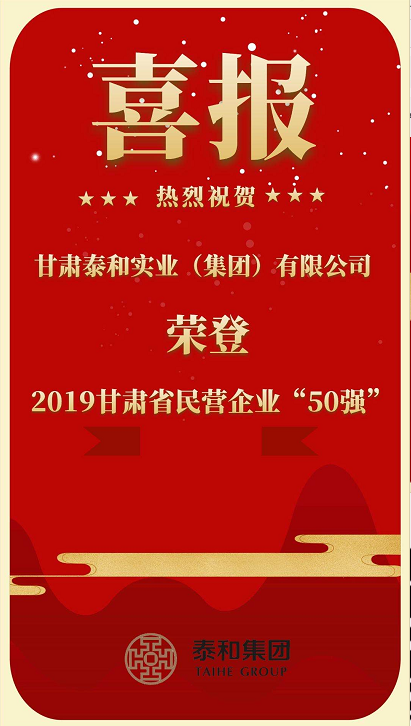 會議上,省工商聯(lián)發(fā)布了甘肅省2019年度民營企業(yè)營業(yè)收入50強榜單。甘肅泰和實業(yè)(集團)有限公司榮居2019年甘肅省民營企業(yè)營業(yè)收入50強第9位。